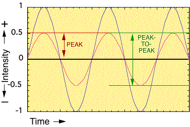 FIGURE 2.1. Peak and Peak-to-peak intensity measurement of a periodic wave. This is one way to represent the maximum dynamic range of a system; intermediate values are represented in the graph (but not internally on the computer) as —floating-point numbers— a number with a value to the left and to the right of the decimal point. On a computer, intensity can be described in arbitrary units (e.g., ±1) for computational purposes, since we are measuring a relative level of a sound sample. We can also use what is termed the signed integer sample value, with numbers ranging from -32767 to 32767. These represent the numbers used internally with 16-bit quantization (see discussion in Chapter 6). Most waveform editing software offer a choice between sample values or % of dynamic range used. We can describe intensity in terms of the peak-to-peak value of the waveform according to a scale (green lines in Figure 2.1). The intensity of a periodic waveform can be easily observed in this way, but non-periodic waves such as those in Figure 2.2 are more difficult to describe in this way. In such cases one can measure intensity by obtaining the root mean square (rms) value. This is obtained by squaring all of the instantaneous values of a waveform over a given period, taking the average of that value, and then obtaining the square root of that number. For instance, the peak value of the blue waveform in Figure 2.1 is 1, but the rms value would be .707. In Figure 2.2, the rms value, in terms of the relative intensity -1 to 1 and in terms of relative dB is shown.