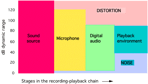 FIGURE 2.4. Illustration of waveform dynamic range, comparing the natural range in dB, the range captured by the recording system, and the ranges of “too much” (distortion), and “not enough” (noise). Note that by changing the relative level of a signal from one stage to another, it can be brought within range. Another means of accomplishing this is via compression (see Chapter 7).