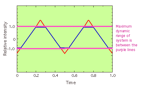 FIGURE 2.5. An illustration of distortion of a triangle wave. The triangle waveform is clipped at the point where the waveform is shown in red, where it exceeds the maximum dynamic range of the audio system. |