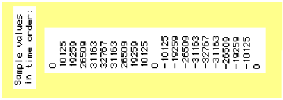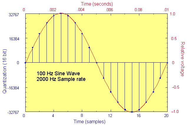 FIGURE 6.1. An analog waveform (red) and its digital representation (blue). In Figure 6.1, the signal is quantized into the range of numbers available from a signed-integer, 16-bit representation. This means we can represent the upper peak voltage value of the analog sine wave at 1.0 volts with the largest signed integer, 32767, and the lower extreme with –32767 (or –32767 in 2's complement encoding). Variations within the voltage range ±1 at proportional digital values in the range ±32767. For instance, if an analog voltage amplitude at a single moment in time was 0.25, then the nearest integer digital value would be 8192 (0.25*32767 = 8191.75, 8192 when rounded up). Figure 6.2 below shows the stream of numbers that result. Note the similarity between the symmetrical pattern of the numerical representation and the graphical representation of the waveform.