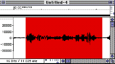 FIGURE 6.13. Cropping the waveform by isolating the usable portion of the recording. Note that using normalization on a set of soundfiles doesn’t mean that they will have the same loudness. This is because the peak intensity values of two soundfiles may be the same, but their rms values could be widely different. If a soundfile has a intermittent transient at peak intensity (e.g., caused by momentarily shorting of the input connection) the normalization will based on this spurious value. Normalization is also not a substitute for a getting as much level in the initial recording as possible. The process amplifies all of the signal and the noise in the soundfile. Click here to listen to a normalized recording of a soundfile that was made with an relatively “hot” input level; and click here to listen to a normalized recording of a soundfile that was made with an inadequate input level. Note that this second example contains much more noise in the recording. In many cases, it is best to normalize