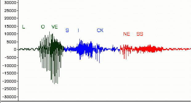 of the rest of the files. Figure 6.14 shows a waveform display of the spoken word "Lovesickness". Click here to listen to the sound. By editing within the middle of the word, we can transform the sound into the word "sickness." What we will attempt to do is to
