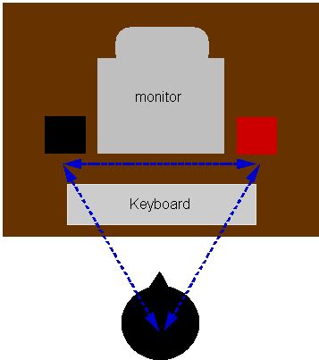 FIGURE 8.1. The “stereo sweet spot” reference point is referenced to the center of the head, equidistant from the two speakers (black and red squares). Left-right channel assignment Click here; you should hear the left speaker only; and Click here; you should hear the right speaker only. If you hear both of these sounds out of both speakers, you probably don’t have stereo playback capability, or you’ve shorted the left and right channels together. First check your sound control panel settings on the software, and then check the connections between the sound card and the loudspeakers. Phase check Here is an audio test for determining loudspeaker phase. This in-phase example (click here) should create a stable image localized in-between the speakers; and this out-of-phase version (click here) should sound split between two locations in the speakers, and sound less loud in one speaker. If the opposite occurs, your speakers are wired out-of-phase. Frequency response To perform these tests, mount the SPL meter to a stand, with the microphone aimed directly between your computer’s speakers. Place it at the stereo sweet spot location shown in previously in Figure 8.1. Try to keep your body from reflecting sound back towards the speakers, or from blocking the sound. Since you’ll need to be observing the level indicated on the meter after clicking your mouse on the appropriate switch, this can be a little tricky at first. For that reason, we’ve added a delay before the test signal begins. Try to minimize the influence of other sound sources in the area (including air ventilation systems). Different non-linear weightings can be applied to how the SPL meter responds to different frequencies; most common are the “A” and “C” weightings. For these tests, use the “C” weighting. If you can choose between different response times, choose “slow”; if you have a choice between “peak” and “average,” select average.