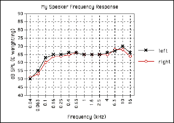 Click hereto get the left speaker 1 kHz tone. Adjust the volume until the SPL meter reads 60–65 dB (reminder: “C” weighting, slow response, average readings). Use a lower volume level if you prefer. This becomes the reference value for the entire test; don’t adjust the volume after this point. Mark it on the graph. Click here to get the right speaker 1 kHz tone. This value should be very close to the value for the left speaker; if not, adjust the balance control or individual right speaker level (if you have them) until it equals the left speaker level. Do the left signal test again if you adjusted a balance control. If you don’t have those controls, this difference is a permanent feature.